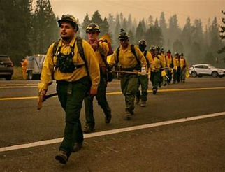 Durante los siguientes días, el incendio cruzó la autopista 50 en las cercanías de Kyburz . A partir del 27 de agosto, los vientos impulsaron el incendio rápidamente hacia el este en dirección a la cuenca del lago Tahoe , devastando el otrora pintoresco telón de fondo del histórico Strawberry Lodge cerca del área de Twin Bridges . Para el 30 de agosto, había llegado a Echo Summit , a menos de 5 millas de South Lake Tahoe . Si bien South Lake Tahoe permaneció en la etapa de advertencia de evacuación durante las reuniones informativas de la madrugada de ese día, se ordenó la evacuación de toda la ciudad de 22.000 habitantes a las 10:59 a. m. Debido a los esfuerzos concentrados de los equipos de bomberos que ralearon agresivamente los bosques cercanos, reduciendo los incendios de copas anteriores (normalmente llamas de 100 a 150 pies) a incendios superficiales (normalmente llamas de 15 pies) y desarrollando un perímetro de incendio, las órdenes de evacuación se levantaron aproximadamente una semana después.